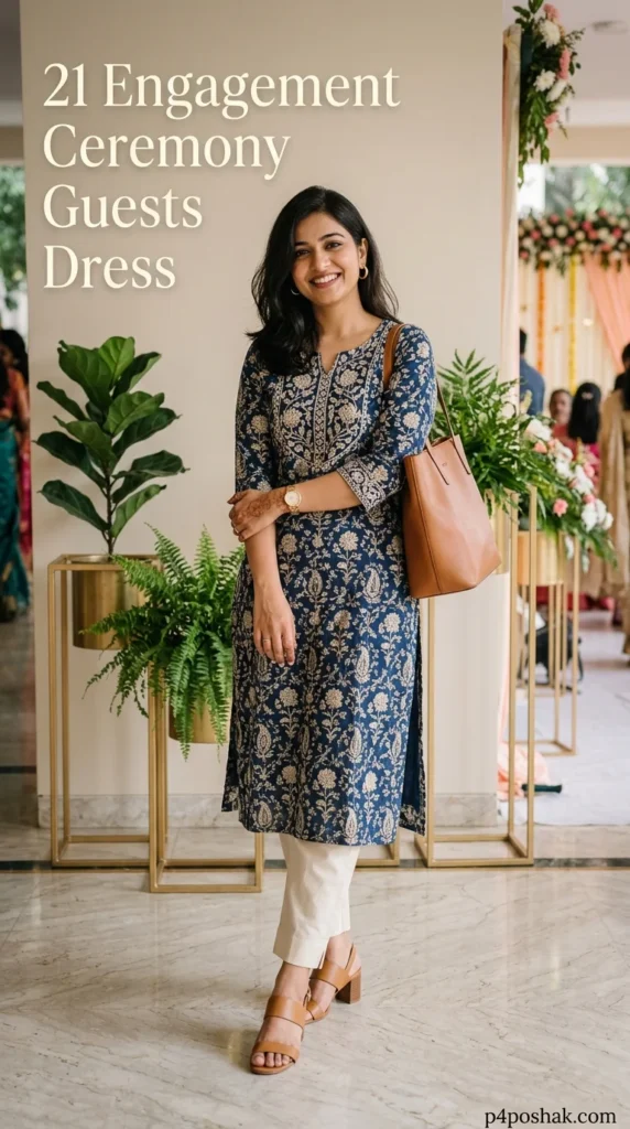 Printed silk outfits combine sophistication with comfort. This look is ideal for guests attending daytime engagement functions or intimate family ceremonies.