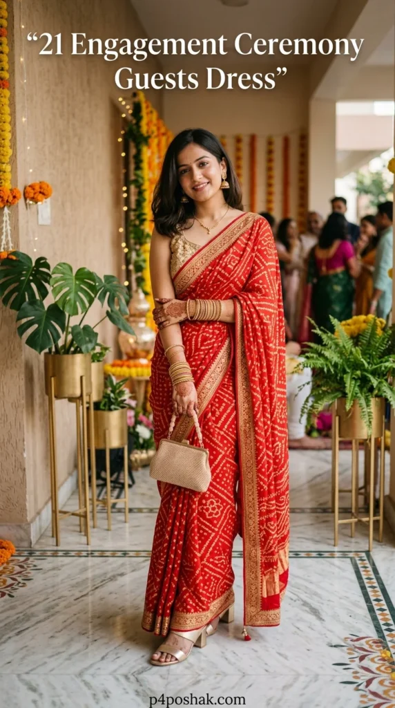 Bandhani sarees represent traditional Indian craftsmanship. This outfit is ideal for guests who love cultural heritage fashion. The vibrant red tone symbolizes celebration and festive energy during engagement ceremonies.