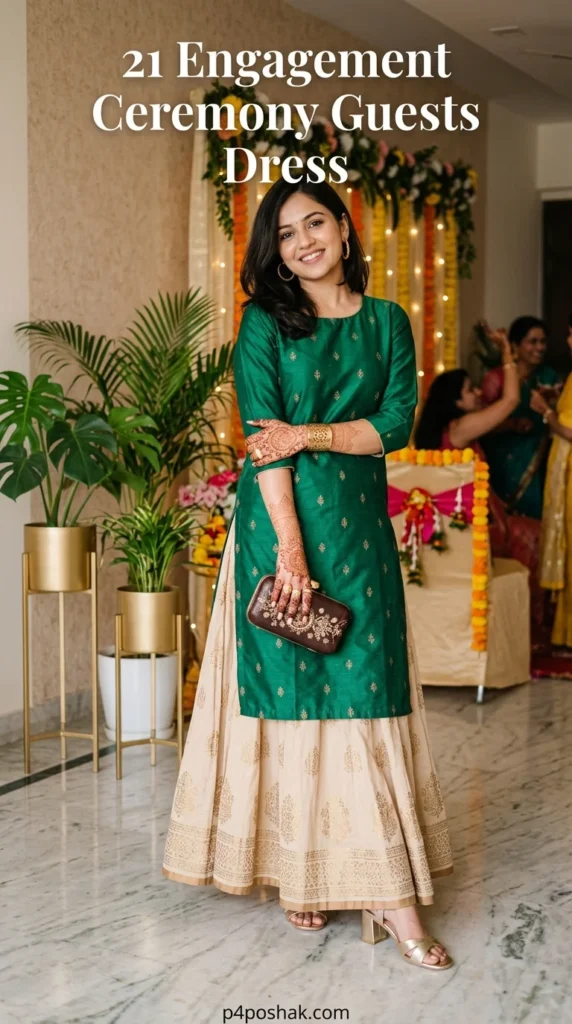 This kurta-skirt combination creates a graceful Indo-fusion look. The emerald green top paired with a soft beige skirt gives a festive yet balanced outfit that works perfectly for engagement events.