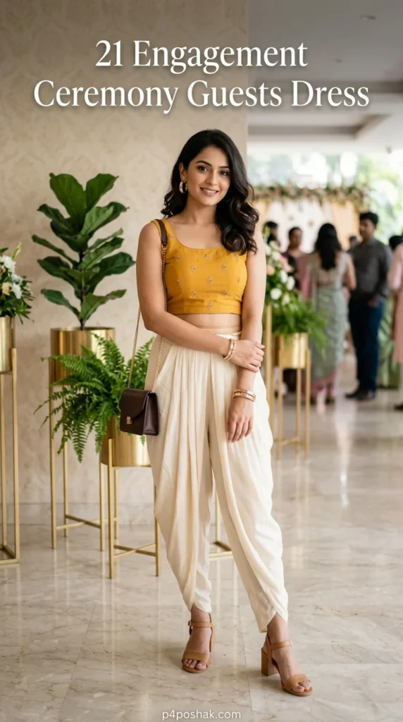 Dhoti sets are among the most fashionable Indo-Western guest outfits. The structured drape creates a bold silhouette while remaining festive. According to wedding style trends seen on Pinterest, dhoti styles are gaining popularity among younger wedding guests.