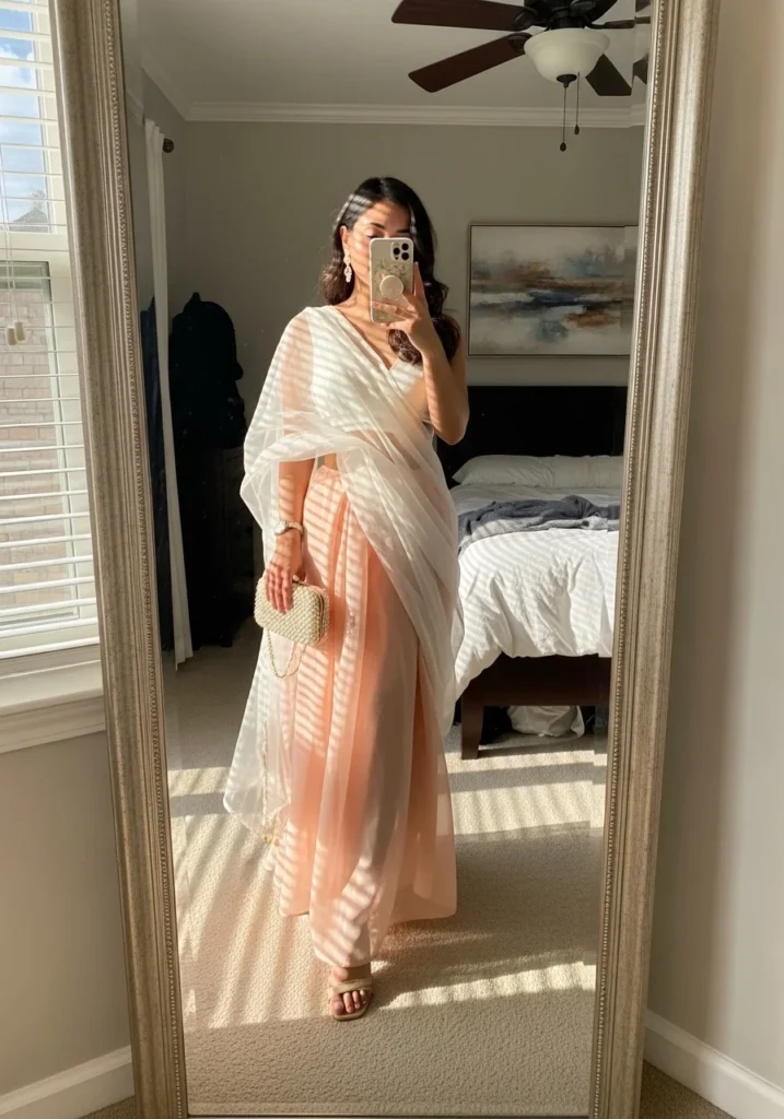 Shop Now from Amazon: Peach Organza Skirt + White Net Dupatta + Nude Sandals + Pearl Clutch