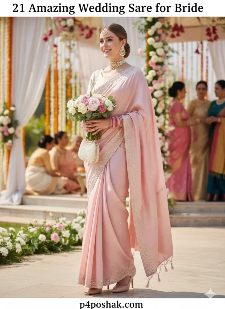Romantic and feminine, this Blush Pink Silk Saree with delicate pearl embroidery is perfect for soft, dreamy bridal looks. Comfortable for long-day ceremonies, it works beautifully in daylight photography. My tip: pair with pearl jewelry to maintain a soft, cohesive style.