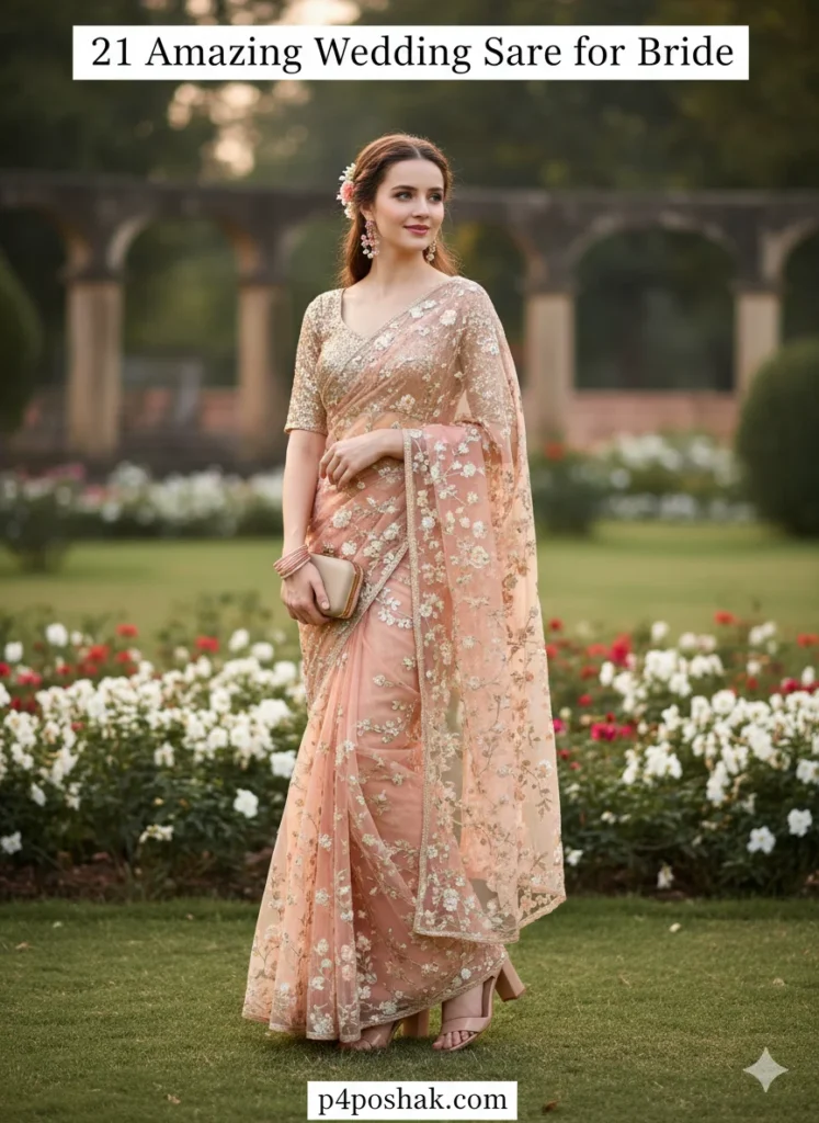A romantic choice, this Peach Net Saree offers lightweight comfort and intricate floral detailing. Brides can move freely while maintaining a dreamy aesthetic. I’ve styled similar outfits for sangeet and pre-wedding shoots — it photographs beautifully under natural light, creating a soft, enchanting vibe.
