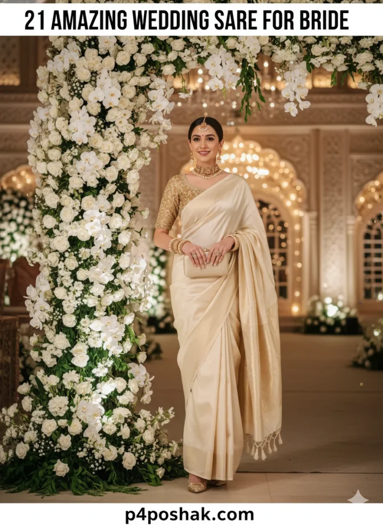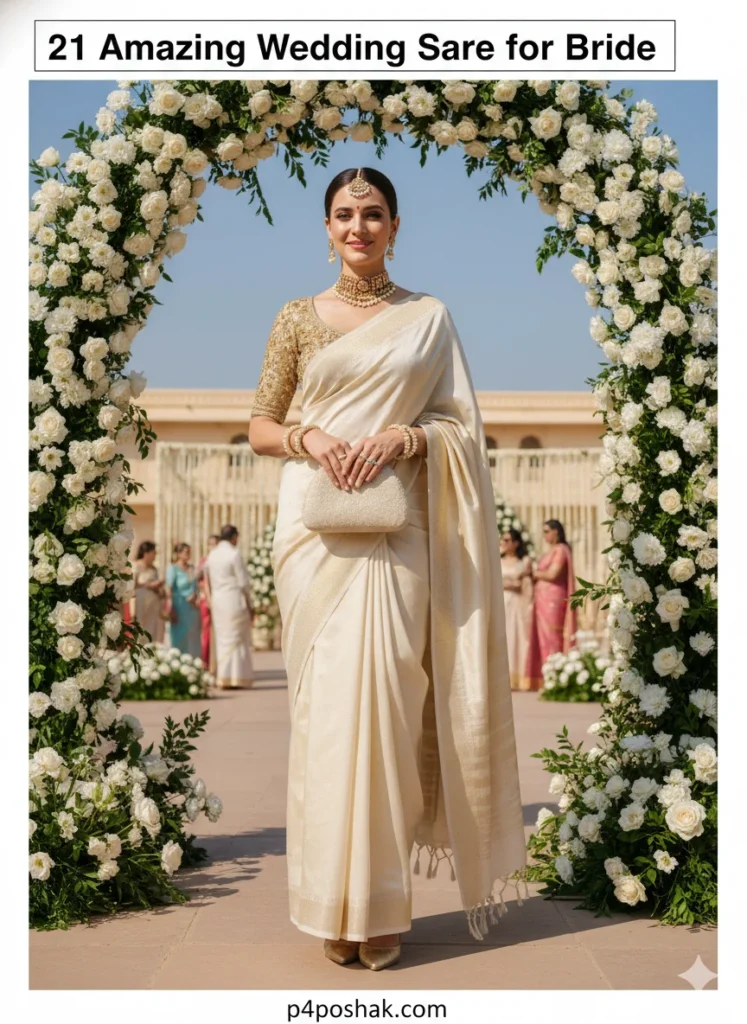 Ivory paired with gold is an evergreen combination for Indian brides aiming for sophistication. The smooth silk and subtle embroidery make it both comfortable and chic. As a tip, I suggest keeping makeup soft and warm to highlight the saree’s elegance. Perfect for daytime wedding rituals or intimate ceremonies.