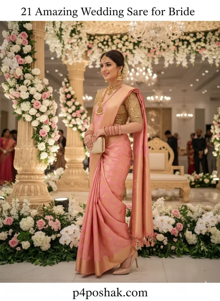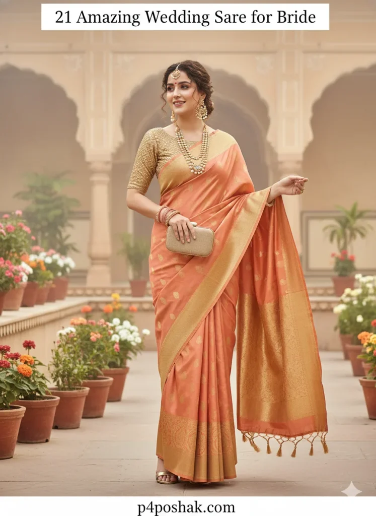 The Peach and Gold Half-and-Half Saree is classy and versatile, combining two tones for a unique, eye-catching bridal style. Comfortable for long wedding functions and perfect for photography. From my experience, pairing this saree with minimal jewelry and soft curls gives a modern yet traditional vibe every bride dreams of.