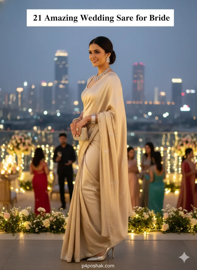Modern and luxurious, this Champagne and Silver Saree is perfect for evening receptions or cocktail-style weddings. The satin fabric drapes elegantly, while subtle silver embroidery adds sparkle. I advise brides to pair this with sleek hairstyles and statement earrings to complete a high-fashion dulhan look.