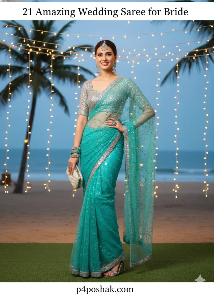 Sparkling and contemporary, the Turquoise Net Saree is ideal for evening wedding receptions or cocktail events. Sequins add shimmer under lights, making brides shine effortlessly. My tip: keep hairstyles simple, allowing the saree and shimmer to be the focus. Perfect for brides looking to combine elegance with a trendy vibe.