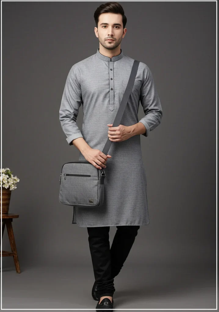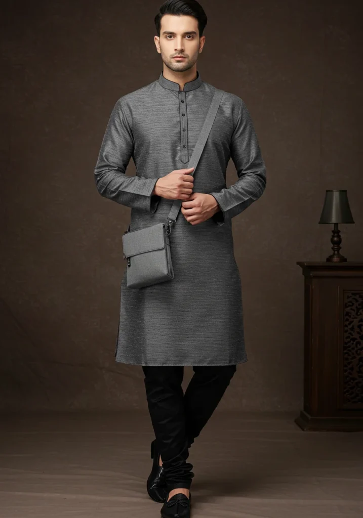 Grey Kurta, Grey Kurta with Black Pajama + Black Loafers + Grey Messenger Bag
