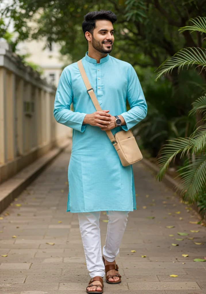 Sky Blue Kurta, Blue Kurta with White Pajama + Brown Sandals + Beige Sling Bag