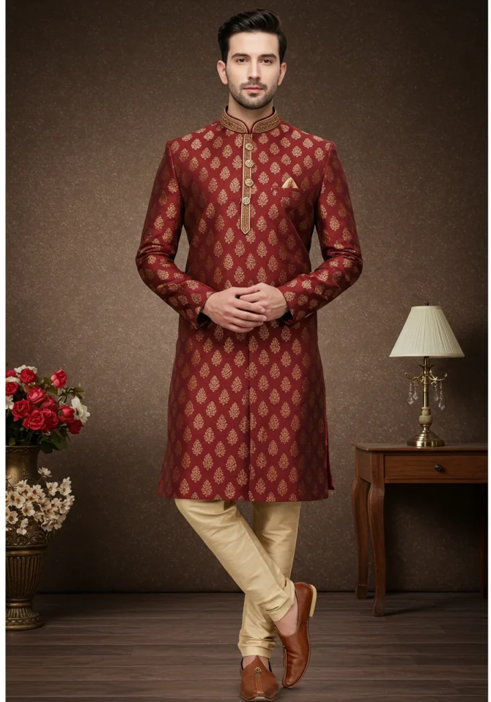 Exuding regal charm, the maroon brocade kurta is perfect for wedding receptions and grand festivities. Its intricate patterns and luxurious fabric make it a standout choice for traditional celebrations.