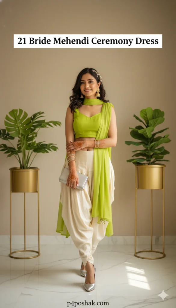 This outfit combines sparkle with comfort, making it ideal for brides planning choreographed performances. Mirror detailing enhances festive shine while dhoti pants allow flexibility. Stylists frequently suggest this look for energetic Mehendi celebrations.
