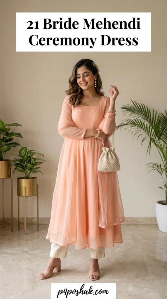 Peach tones add softness and elegance ideal for daytime Mehendi ceremonies. Lightweight fabrics keep the bride relaxed during rituals. Many brides prefer peach shades because they complement floral décor and natural makeup beautifully.