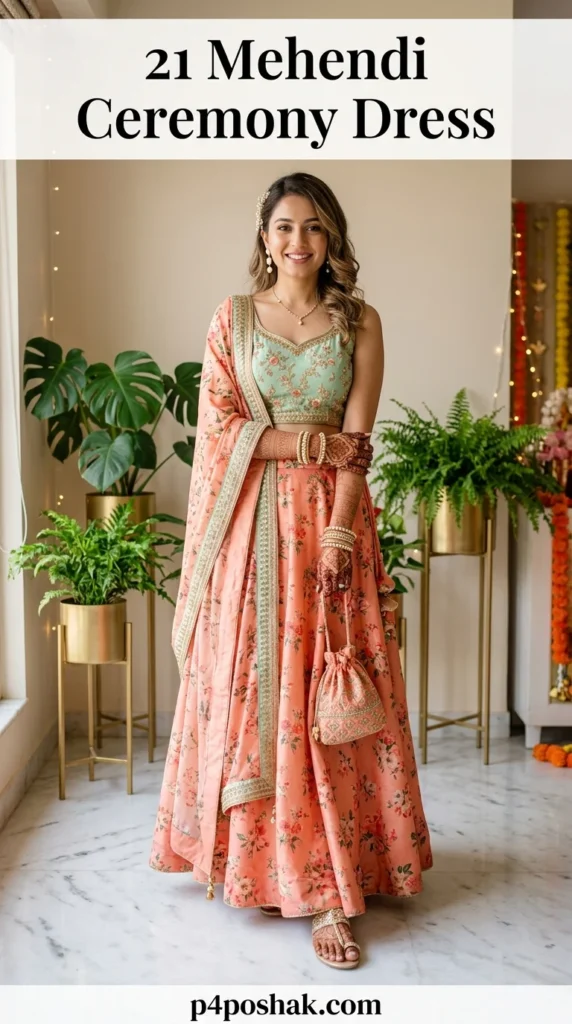 1. Floral Printed Lehenga Choli with Dupatta (Classic Mehendi Bride Look)