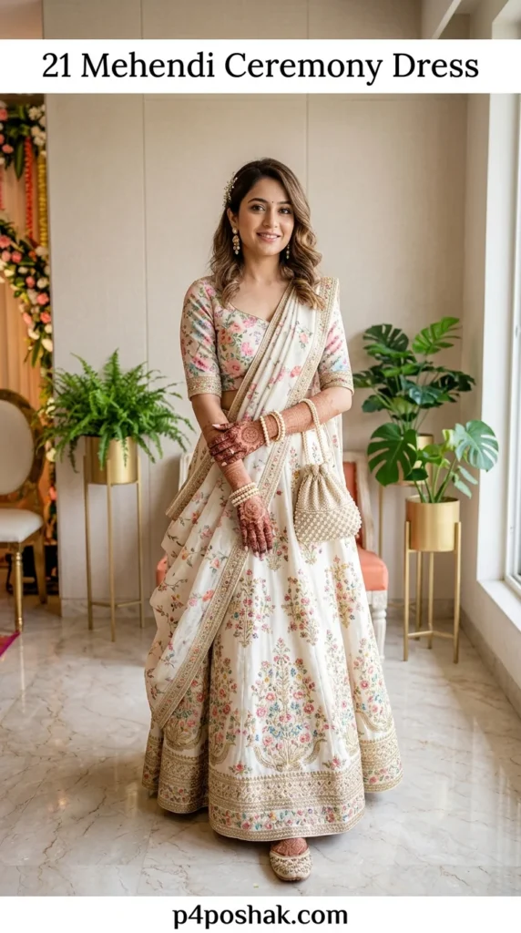 Ivory adds elegance while pastel flowers maintain festive charm. Brides who prefer subtle sophistication often choose this style. Wedding experts advise lighter bases because they enhance Mehendi designs visually during close-up photography.