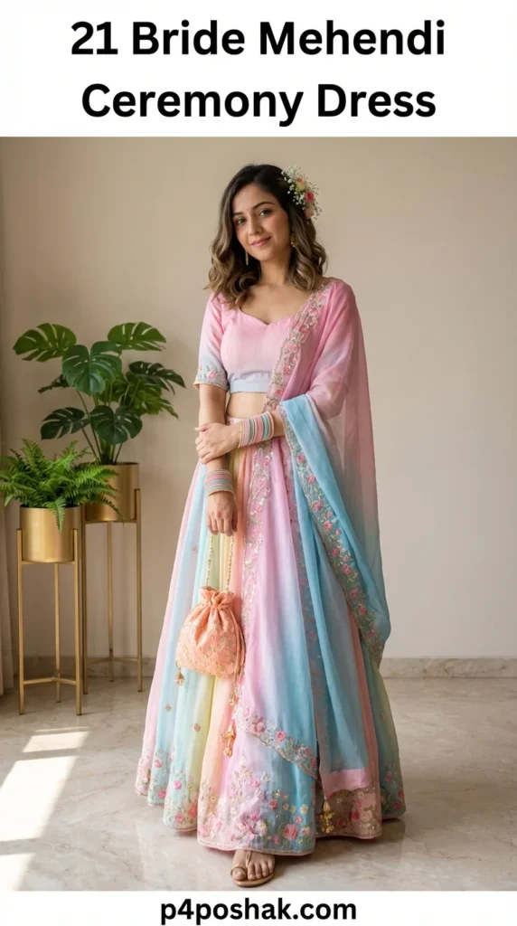 This trending color combination dominates modern bridal fashion feeds. Paired with flower tiaras and soft dewy makeup, it creates a dreamy aesthetic. Fashion editors frequently highlight pastel florals as the most photogenic Mehendi outfit choice.