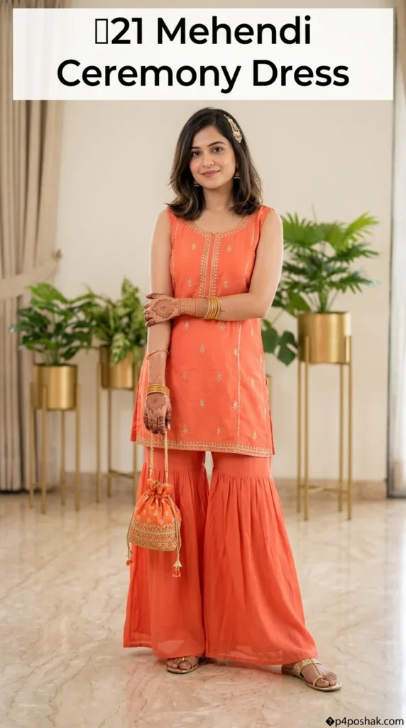 Dhoti pants allow effortless movement during rituals and dancing. This Indo-western outfit suits brides wanting a bold contemporary look. From styling experience, brides appreciate dhoti sets because they remain comfortable during long Mehendi sitting sessions.