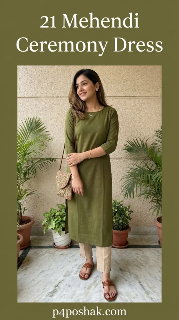 Shop Now from Amazon: Olive Green Straight Kurta + Beige Cigarette Pants + Brown Leather Sandals + Embroidered Sling Bag