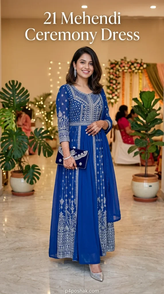 This georgette gown offers a dramatic, floor-sweeping finish for an evening Mehendi. The deep royal blue shade commands attention and exudes pure elegance. I recommend a sleek high ponytail to showcase any intricate neckline or shoulder detailing.