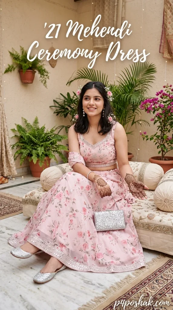 For a soft and romantic look, this floral lehenga is unmatched. It balances traditional flair with a modern, airy feel. Having worn this style, I suggest a lightweight dupatta to keep your hands free for the henna application.