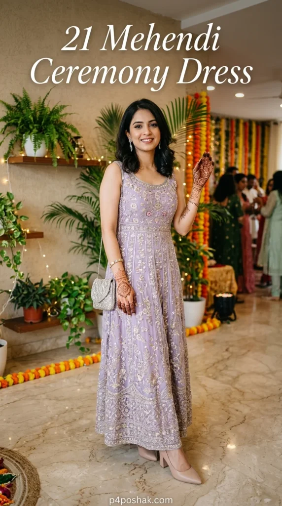 This regal Mehendi ceremony dress for guest offers a timeless silhouette that never fails. I recommend choosing heavy embroidery on the yoke to draw attention upward. It’s incredibly comfortable for long ceremonies while maintaining a sophisticated, high-fashion aesthetic.