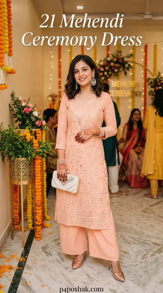 Mirror work adds a festive sparkle that is perfect for a Mehendi ceremony dress for guest. The soft peach tone is universally flattering. I suggest choosing a breathable cotton-silk blend to stay cool throughout the event.