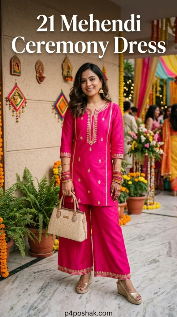 According to Pinterest wedding trend reports, searches for ‘vibrant guest outfits for Mehendi’ increased by 60% in the last two years, showing how modern guests prefer lightweight and photogenic outfits for these high-energy ceremonies. Let’s explore 21 stunning options that will help you stay on-trend and look effortlessly classy.