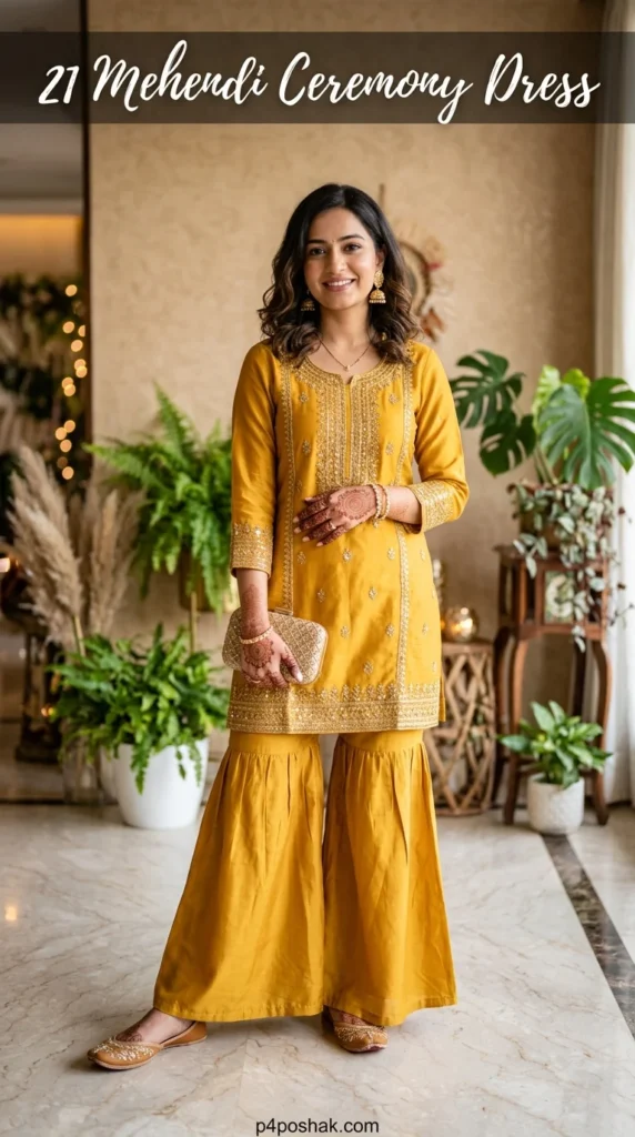 Mustard is a classic choice for Mehendi rituals, ensuring you stand out with a playful vibe. Pair it with lightweight jewelry to avoid fatigue during the festivities. This look creates a high-fashion Statement for any wedding guest.