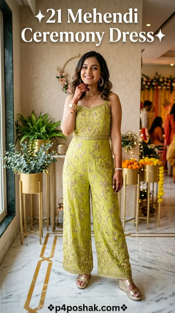 This teal jumpsuit is the ultimate contemporary Mehendi ceremony dress for guest. It’s practical, chic, and allows for easy movement during dance performances. Style it with a statement belt to accentuate your waist for a sharp, modern silhouette.
