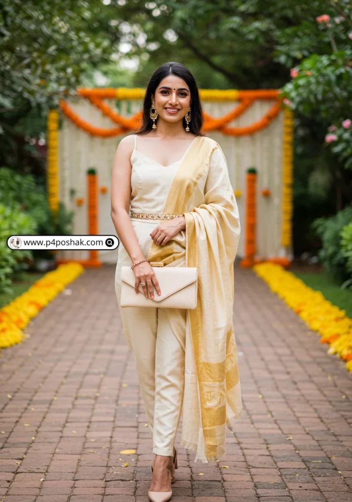 Shop Now from Amazon: Ivory Jumpsuit + Gold Dupatta + Nude Heels + Ivory Clutch
