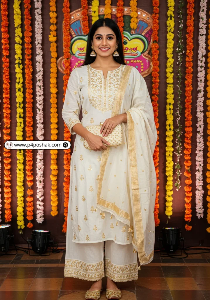 Shop Now from Amazon: White Kurta + White Palazzo + Gold Embroidered Dupatta + Gold Juttis + Beige Clutch