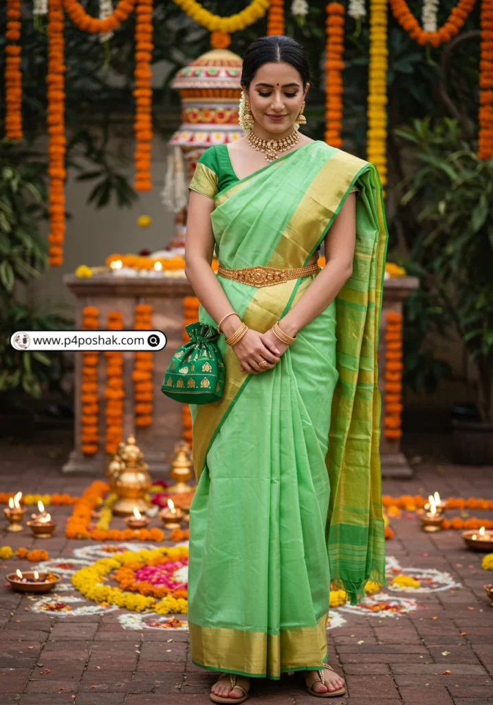 Shop Now from Amazon: Pastel Green Saree + Golden Blouse + Gold Sandals + Green Potli Bag