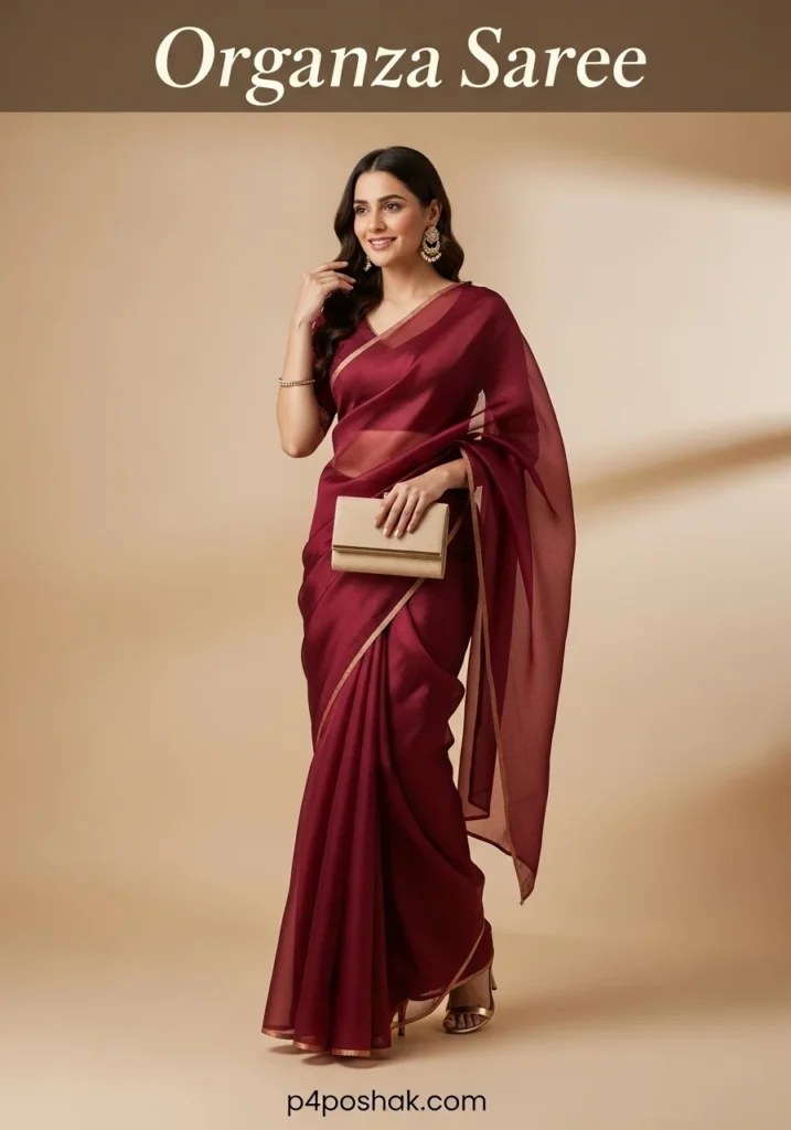 Burgundy organza saree with golden thread is perfect for evening receptions. Deep shades create sophistication while silk fabric ensures comfort. Tip: pair with bold lipstick to complete the look.