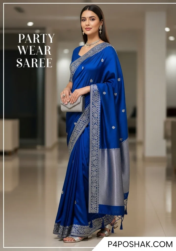 A luxurious royal blue silk party wear saree is ideal for weddings or formal gatherings. Rich silk drapes beautifully and adds sophistication. Silver accessories enhance elegance, and adding a sleek belt can modernize this classic look effortlessly.
