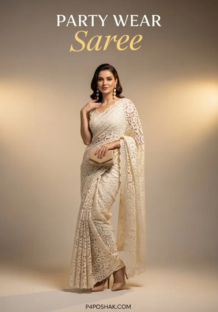 Ivory lace party wear saree is delicate and elegant. Lightweight and breathable, it’s comfortable for long events. Nude heels and beige clutch enhance the soft, classy look. Perfect for daytime brunches or summer parties.