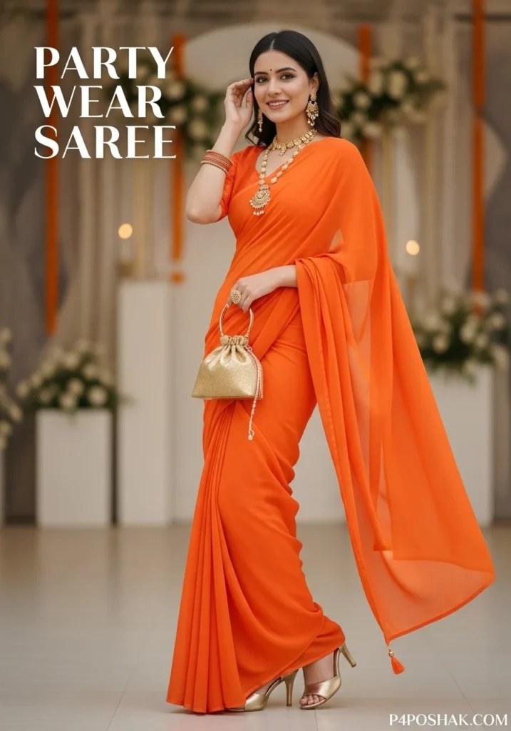 Orange georgette party wear saree is vibrant and festive. Flowing fabric ensures comfort, while subtle embroidery adds glamour. Gold heels and bag complete this cheerful look. Ideal for Diwali celebrations or evening functions.