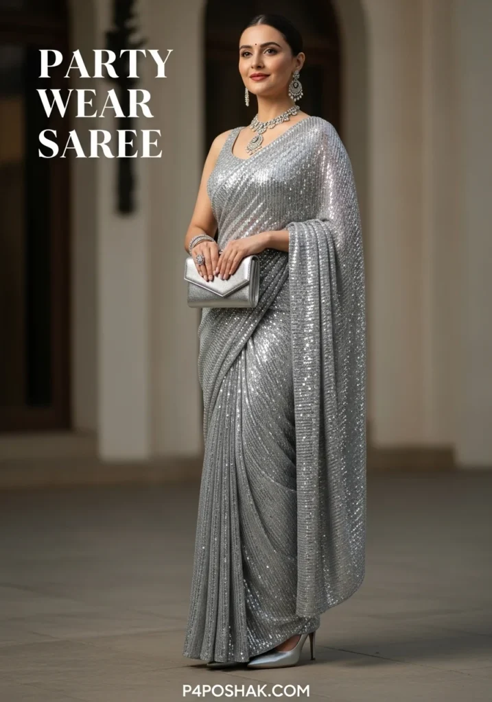 A silver sequined party wear saree makes you sparkle at night parties. Sequins catch the light beautifully, creating a glamorous effect. Pair with silver heels and bag for a sleek, coordinated style. Tip: Minimal jewelry keeps the focus on the shine.