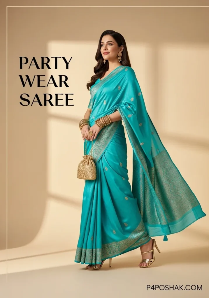 Turquoise silk party wear saree is refreshing and vibrant. Luxurious silk drapes perfectly, offering elegance and comfort. Gold heels and bag create a harmonious festive look. Perfect for summer weddings or evening receptions.