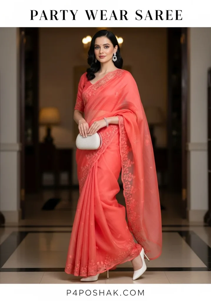 Coral organza party wear saree is bright, airy, and perfect for daytime celebrations. Lightweight fabric ensures ease of movement while soft embroidery adds charm. White accessories make the look fresh and chic. Ideal for brunch parties or garden events.