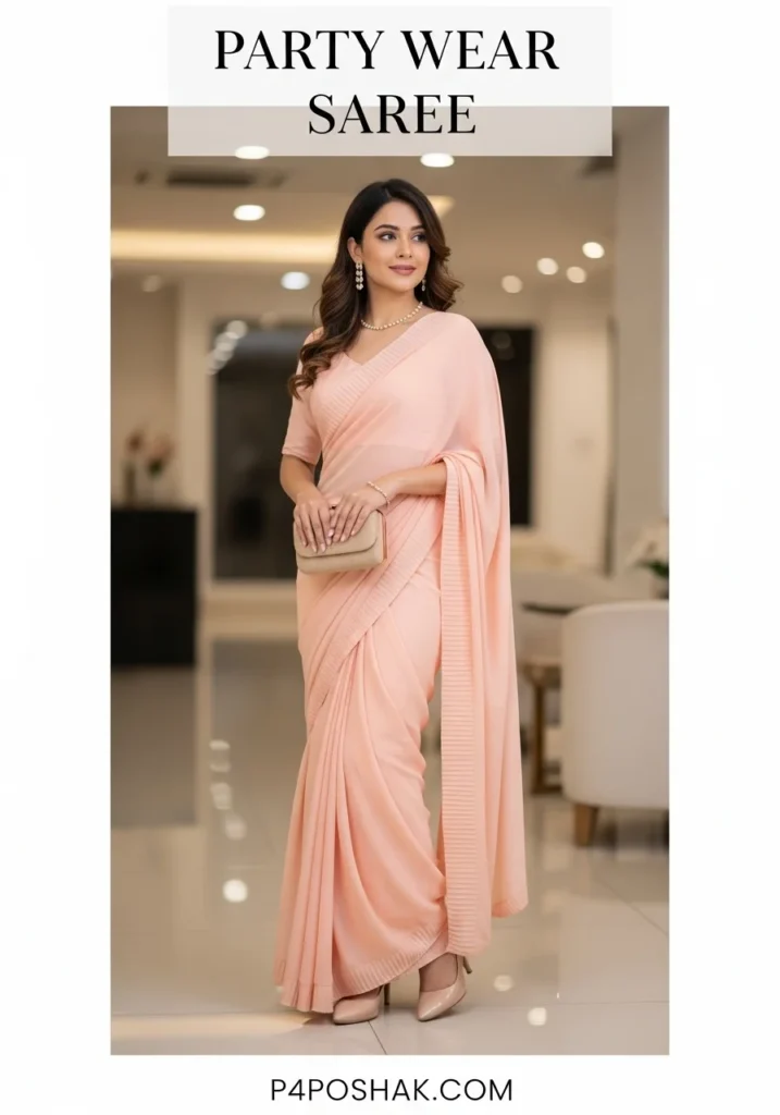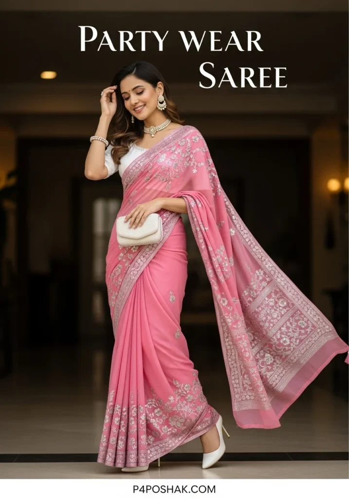 A soft pink georgette party wear saree is feminine and elegant. Flowing fabric adds grace for daytime or evening events. Pair with pearls for a romantic touch. Comfortable enough to socialize or dance, making it versatile for many occasions.