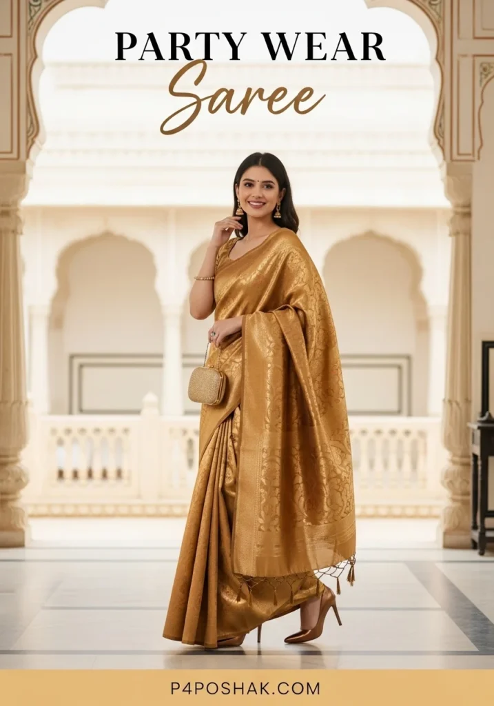 Golden brocade party wear saree is regal and festive. Perfect for weddings or Diwali parties, it shines under lights. Bronze heels add warmth while a gold bag completes the opulent look. Tip: Keep jewelry minimal to let the saree shine.