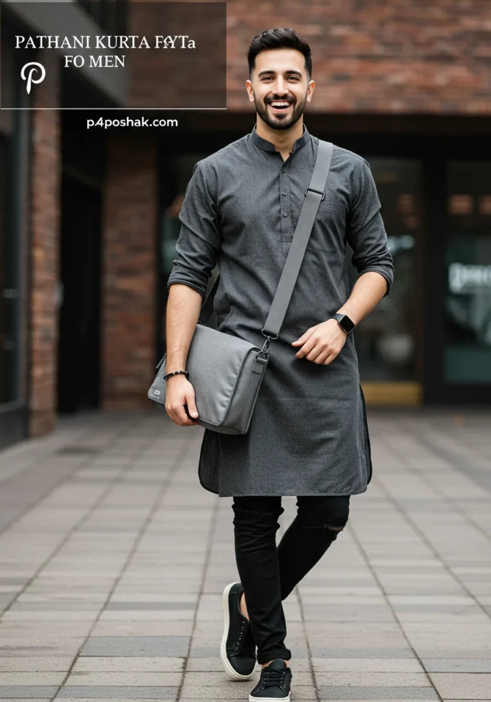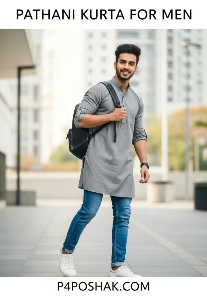 Give your ethnic look a cool modern twist. Pairing a grey Pathani kurta for men with jeans makes it perfect for college events or casual Fridays. Roll up the sleeves for that relaxed, trendy edge.