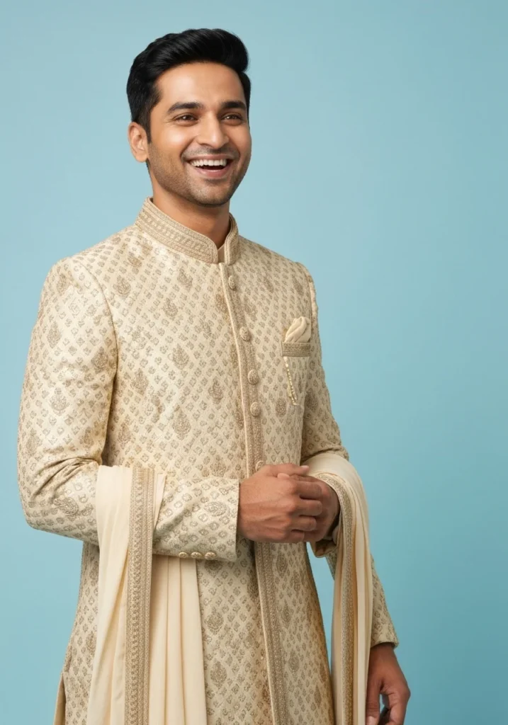If you’re dressing for a wedding, this cream Pathani kurta for men with a golden dupatta is pure royalty. The soft color tone and shimmer details make it ideal for traditional or family ceremonies.