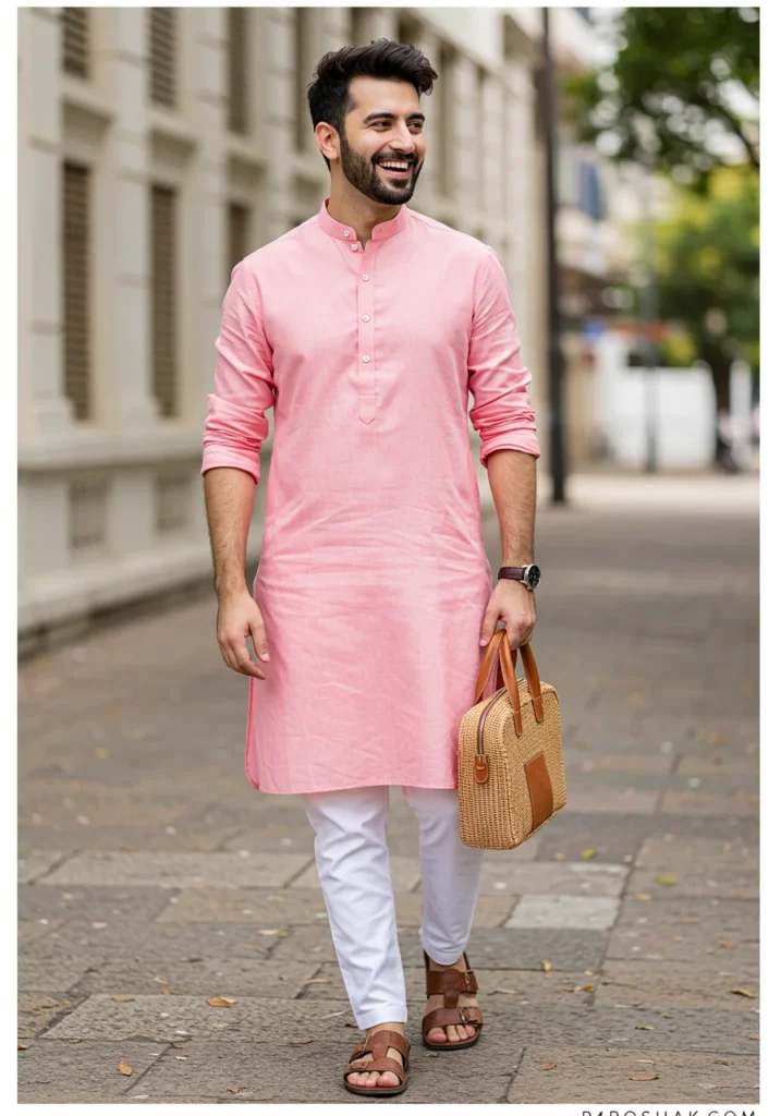 Shop Now from Amazon: Pastel Pink Pathani Kurta + White Pajama + Beige Sandals + Tan Bag