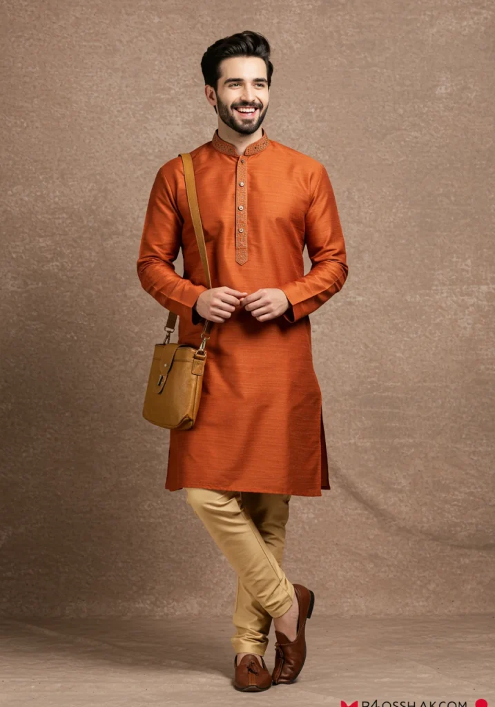 Shop Now from Amazon: Rust Orange Pathani Kurta + Beige Churidar + Brown Mojaris + Tan Bag