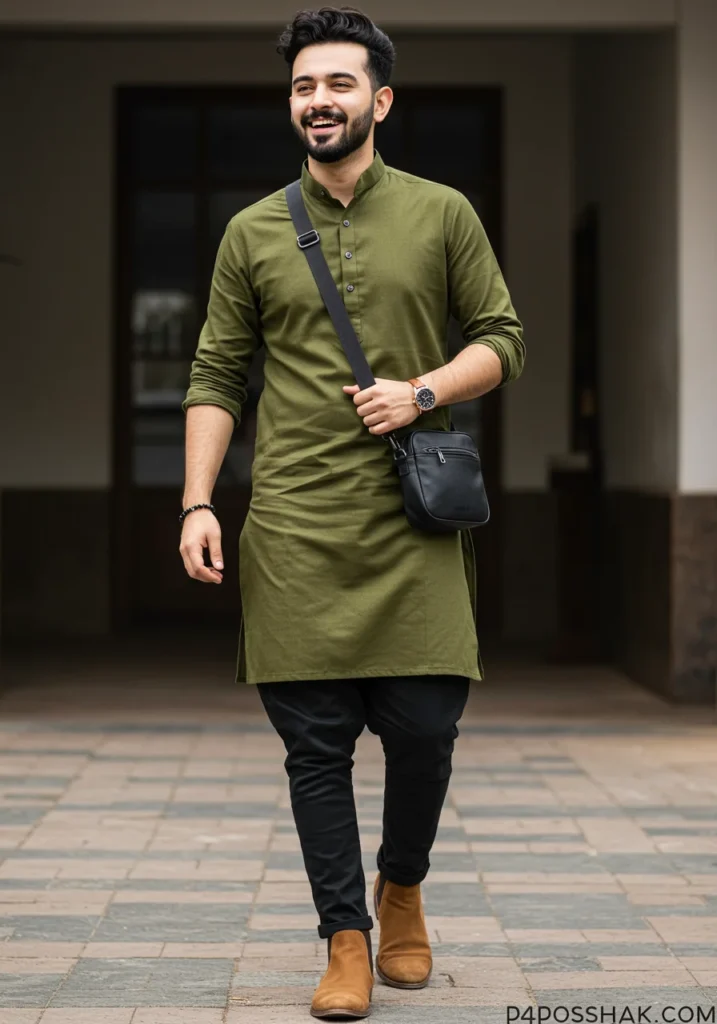 Shop Now from Amazon: Khaki Pathani Kurta + Black Jeans + Brown Boots + Black Crossbody Bag