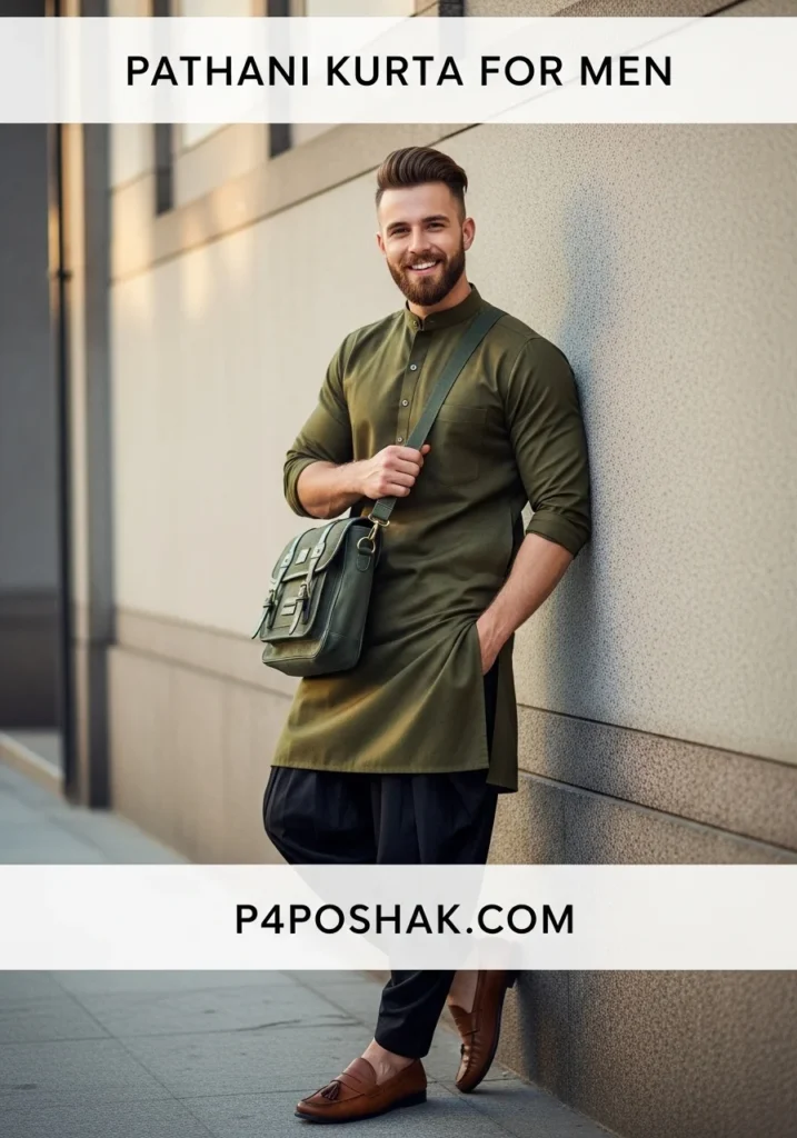 Shop Now from Amazon: Olive Green Pathani Kurta + Black Salwar + Brown Loafers + Dark Green Satchel Bag