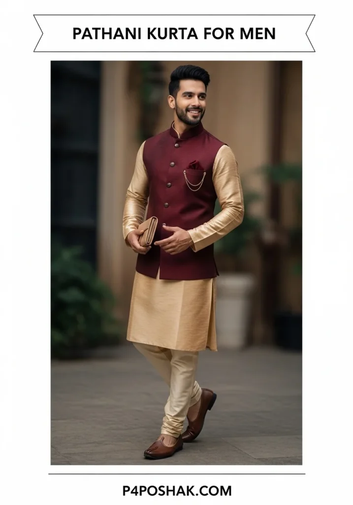 Looking for a classy wedding guest look? This beige Pathani kurta for men layered with a maroon jacket gives instant regal energy. MensXP notes that Nehru jackets add sharpness and structure to traditional outfits.