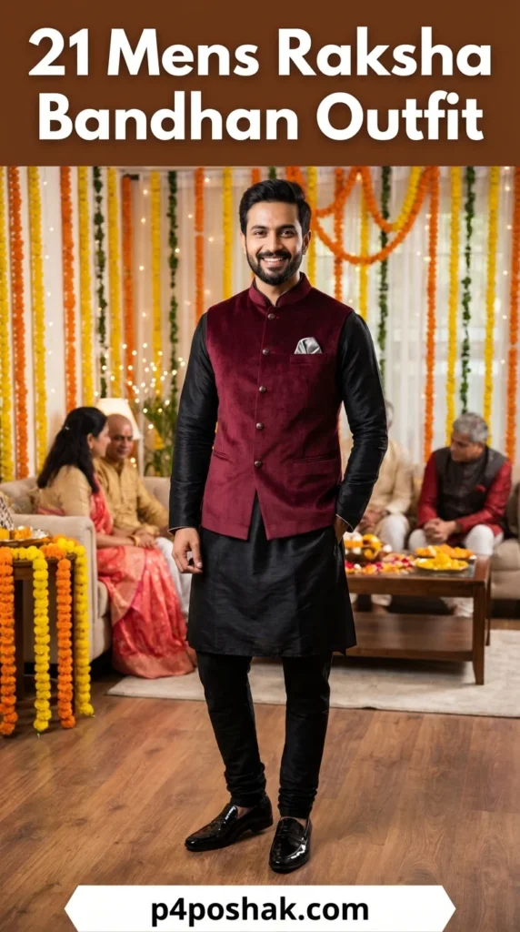 If your family hosts a lavish evening Rakhi dinner, this rich burgundy and black outfit is your best bet. The plush velvet adds an expensive, confident touch while the dark tones flatter everyone. Add a metallic pocket square for sharp contrast.