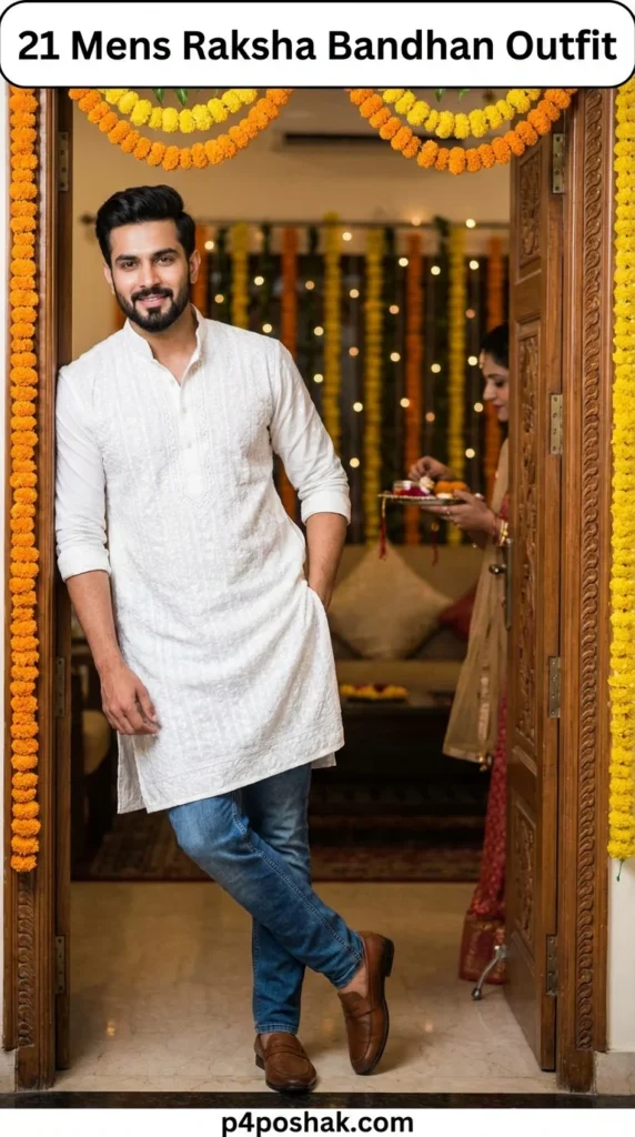 For a contemporary vibe, consider a short Lucknowi chikan kurta with slim-fit trousers or a stylish Indo-western asymmetric kurta. Since Rakhi usually falls during warm, humid months, choose breathable fabrics like cotton or linen in cheerful colors like mustard yellow or sky blue. Explore our curated list of 21 unique styles below to find the best look for your sibling celebration.