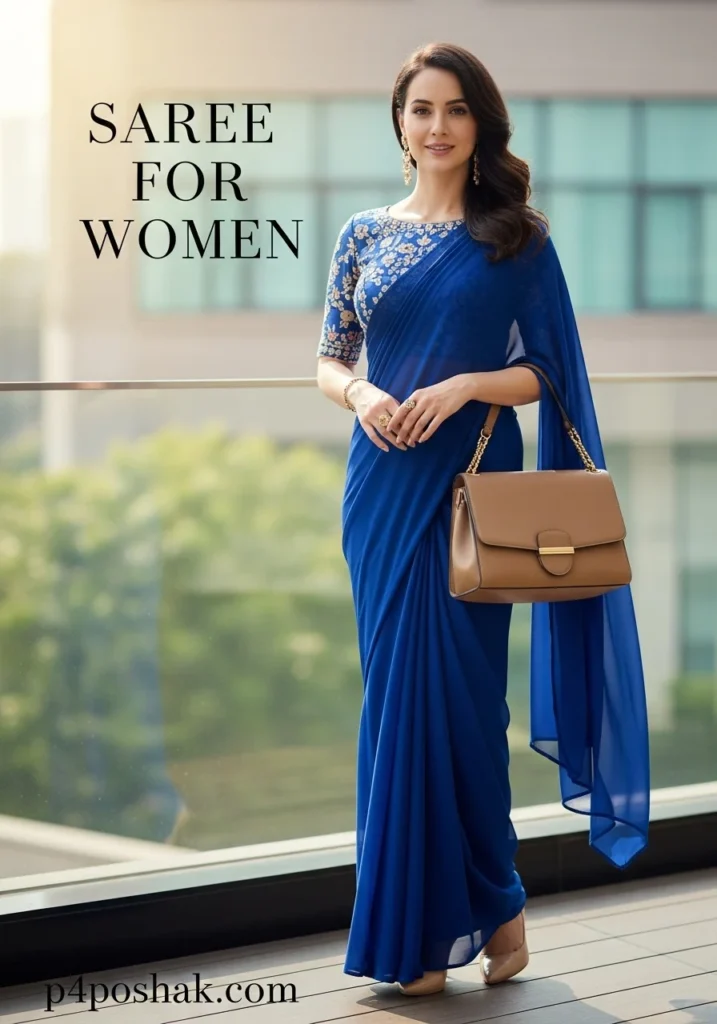 The royal blue chiffon saree is flowy and elegant, suitable for evening parties or formal gatherings. The embroidered blouse gives a regal touch while remaining lightweight and easy to style. From personal experience, pairing it with nude heels elongates the legs and balances the overall look beautifully.